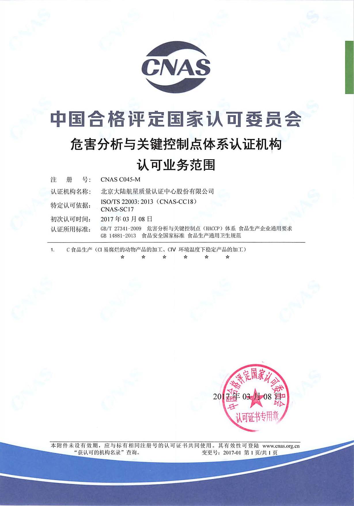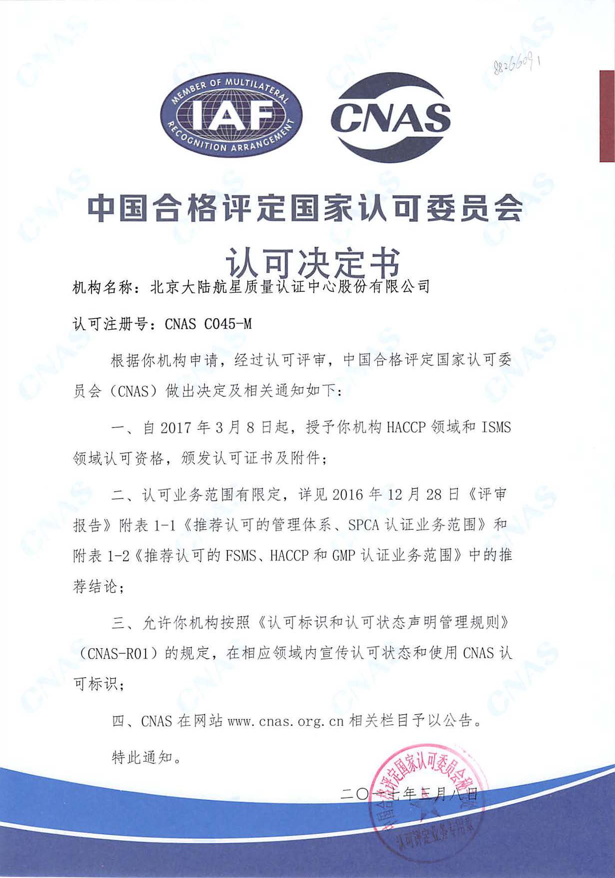 2017年3月8日北京大陸航星質(zhì)量認(rèn)證中心股份有限公司(以下簡(jiǎn)稱HXQC),順利通過(guò)中國(guó)合格評(píng)定國(guó)家認(rèn)可委員會(huì)(CNAS)信息安全管理體系(ISMS)和危害分析與關(guān)鍵控制點(diǎn)(HACCP)領(lǐng)域初次認(rèn)可,授予我公司HACCP領(lǐng)域和ISMS領(lǐng)域認(rèn)可資格,并換發(fā)了認(rèn)可證書。
