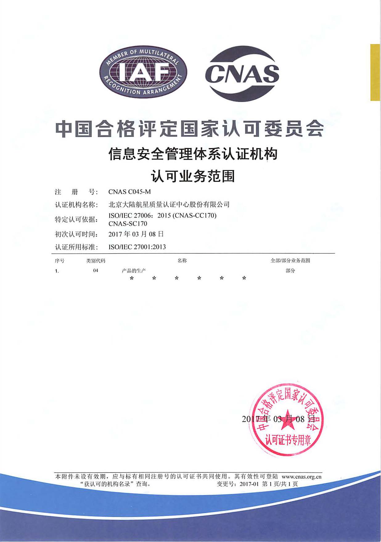 此次新增CNAS認(rèn)可范圍:HACCP:C大類,食品生產(chǎn)(CI易腐爛的動(dòng)物產(chǎn)品的加工、CIV環(huán)境溫度下穩(wěn)定產(chǎn)品的加工);ISMS:04大類,產(chǎn)品的生產(chǎn)(04.08信息與通信技術(shù),例如軟、硬件生產(chǎn)及其服務(wù),系統(tǒng)集成及其務(wù),數(shù)字版權(quán)保護(hù)等)。