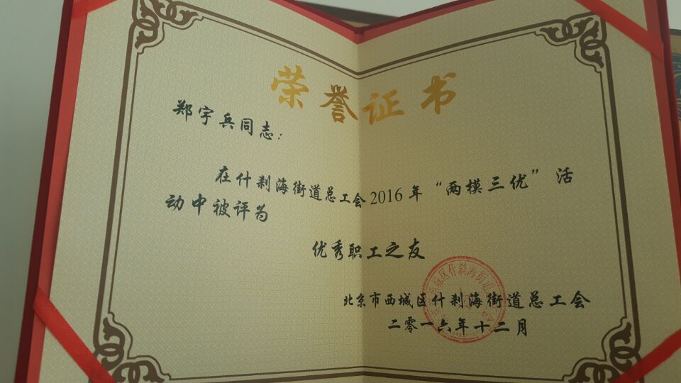 北京大陸航星質(zhì)量認證中心股份有限公司總經(jīng)理鄭宇兵在什剎海街道總工會2016年“兩模三優(yōu)”活動中被評為優(yōu)秀職工之友。