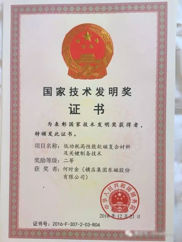 1月9號,北京大陸航星質(zhì)量認(rèn)證中心股份有限公司客戶橫店集團(tuán)東磁股份有限公司董事長何時金與浙江大學(xué)團(tuán)隊共同發(fā)明的“低功耗高性能軟磁復(fù)合材料及關(guān)鍵制備技術(shù)”,在人民大會堂舉行的一年一度國家科學(xué)技術(shù)獎勵大會上獲得國家技術(shù)發(fā)明獎二等獎,受到表彰。