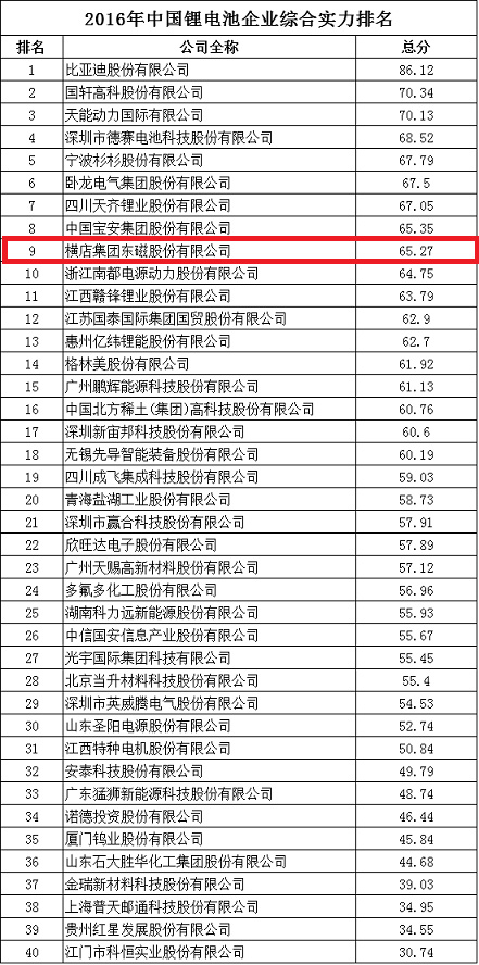 近日,新華網(wǎng)聯(lián)合唐宋大數(shù)據(jù)產(chǎn)業(yè)股份有限公司在北京發(fā)布的《2016年中國鋰電池企業(yè)綜合實(shí)力排名》榜單,對(duì)國內(nèi)主要鋰電池企業(yè)的綜合實(shí)力進(jìn)行排名。于去年底開始組織實(shí)施鋰離子動(dòng)力電池項(xiàng)目的橫店集團(tuán)東磁股份有限公司,以其強(qiáng)大的實(shí)力和發(fā)展速度,強(qiáng)勢(shì)進(jìn)入中國鋰電池企業(yè)前十榜單,位列第九。